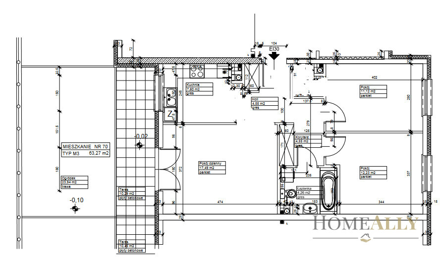 W pokojach na podłodze lita deska możliwa do cyklinowania. W łazience i w kuchni gres.