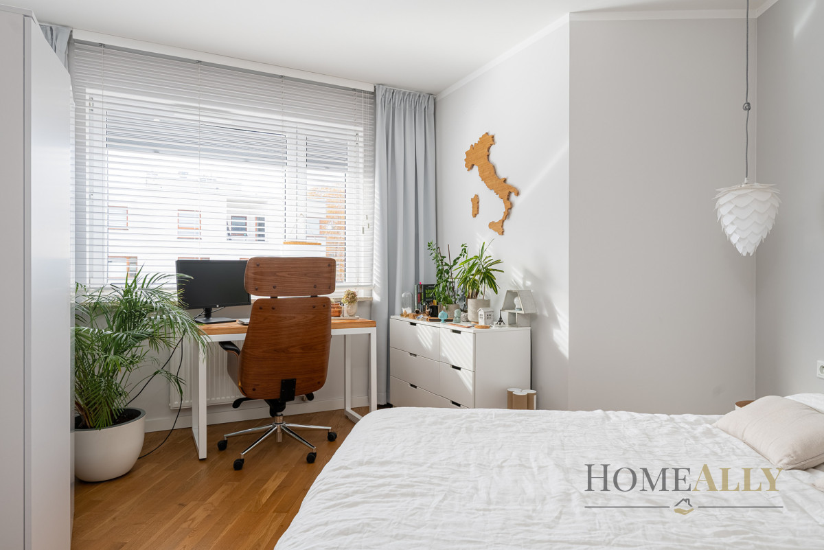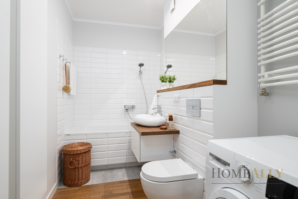 The apartment is in very good condition — ready to move in and decorated in a modern style. Oak parquet flooring in the rooms and partly in the bathroom. Movable furniture available for an additional fee.