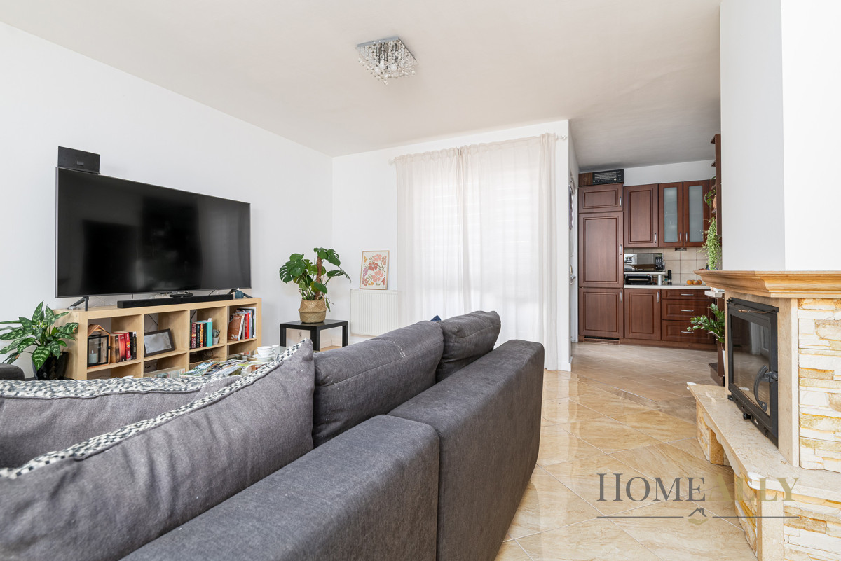 - Salon z kominkiem z którego wyjdziemy na balkon (6 m2),